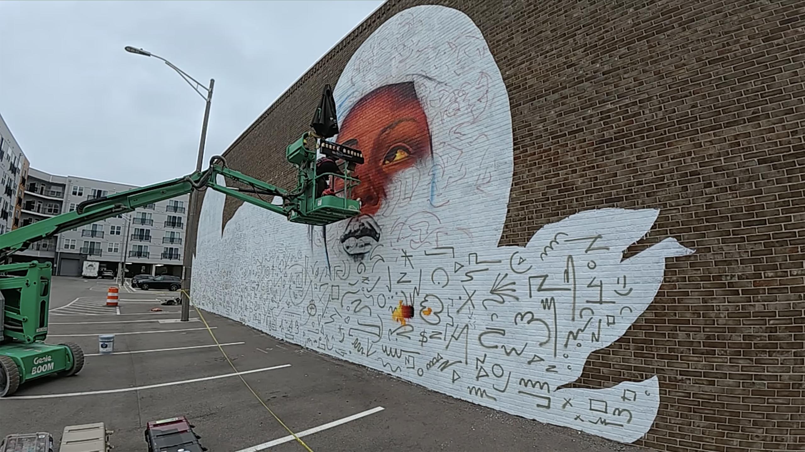 A peek at the large-scale mural on the south-facing wall of the Ovation, by accomplished artist Max Sansing. This statement piece will be the first thing you see heading north from REO Town or along I-496. Want to make your mark and support this mural? Become a Founding Supporter. Your gift will directly support this piece, as well as a custom metal and neon “Lansing, MI” placemaking sign at the Ovation.